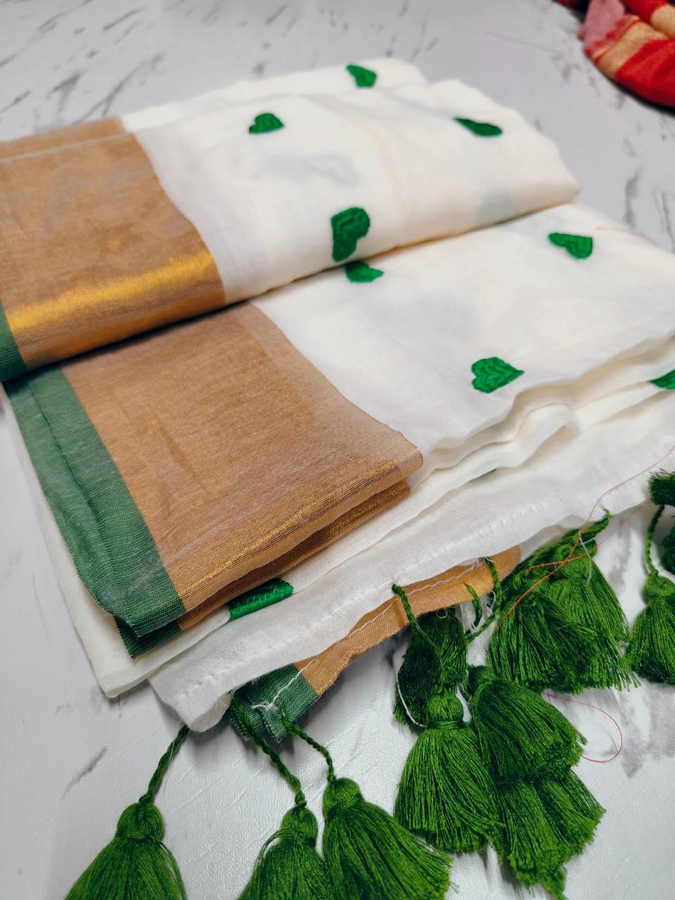 White & Green Embroidery Mulmul Cotton Saree for Women | Soft & Lightweight Ethnic Wear