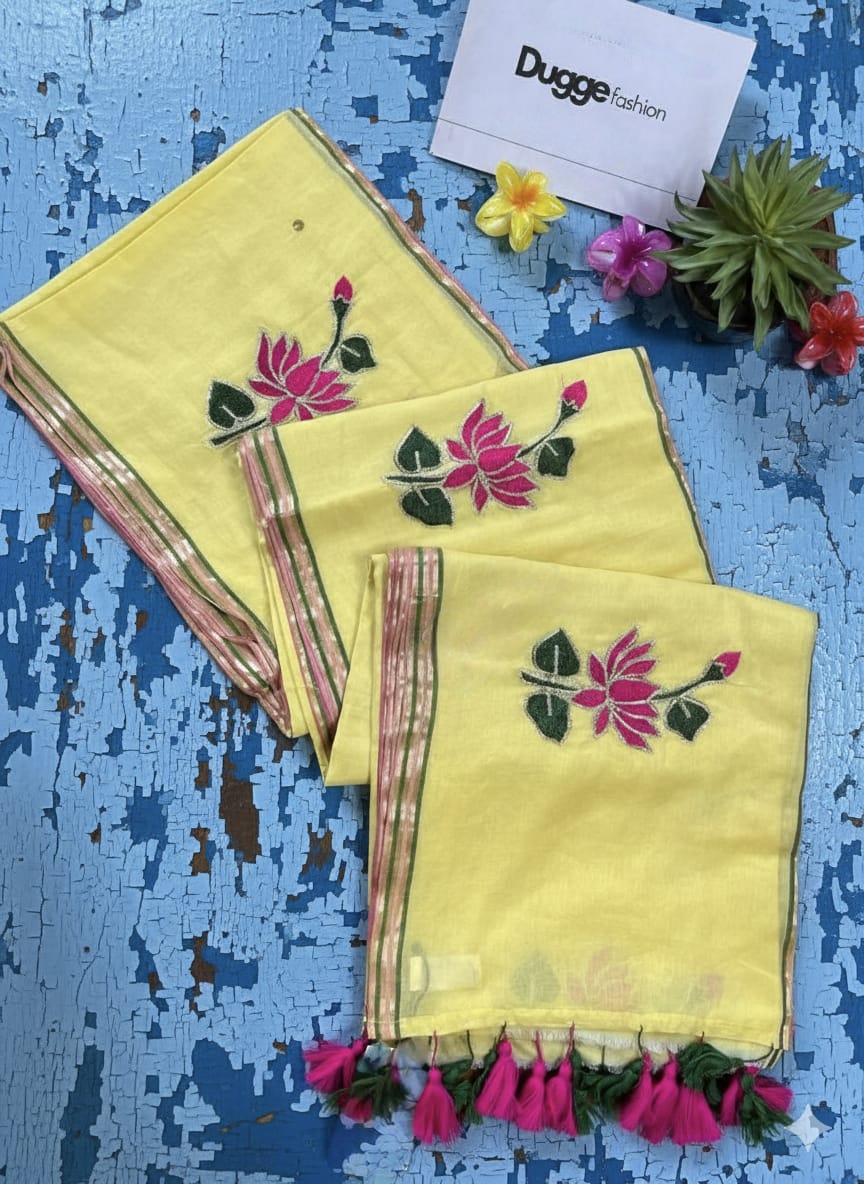 Yellow Soft White Mulmul Saree | Floral Hand-Embroidery | Lightweight Summer Wear